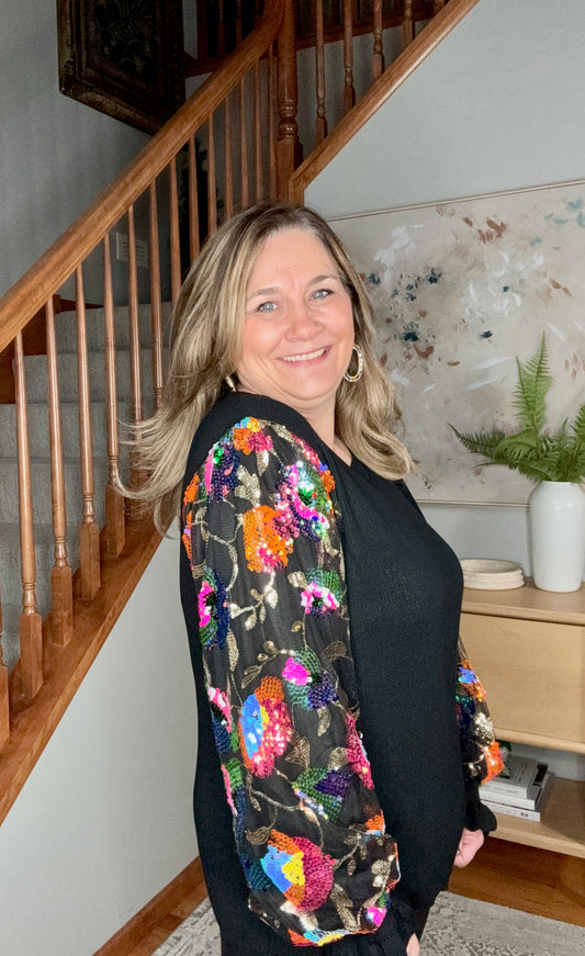 She is the Party Floral Sequins Mesh Sleeve Top