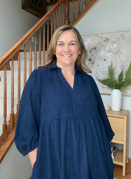 Navy Days Tiered Corduroy Mini Dress with Balloon Sleeves