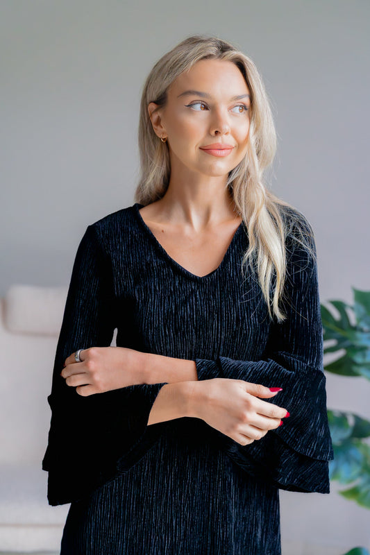 Starlit Elegance Black Long Sleeve Midi Tiered Dress