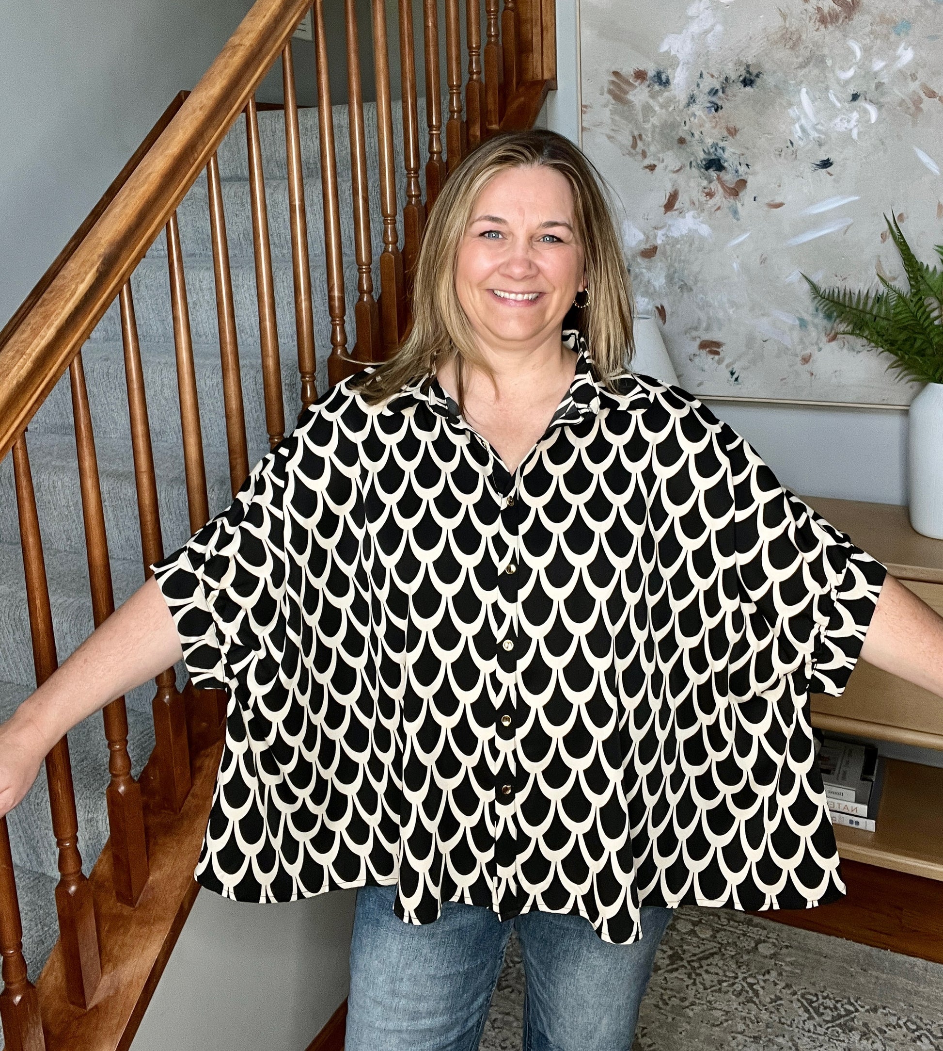 Take your look back to the roaring twenties with our Art Deco Button Up Blouse! Its lightweight woven fabric, dolman sleeves, and banded sleeve cuffs offer an ultra-comfortable fit and timeless style. With its eye-catching art deco print and oversized boxy fit, you're sure to stand out!