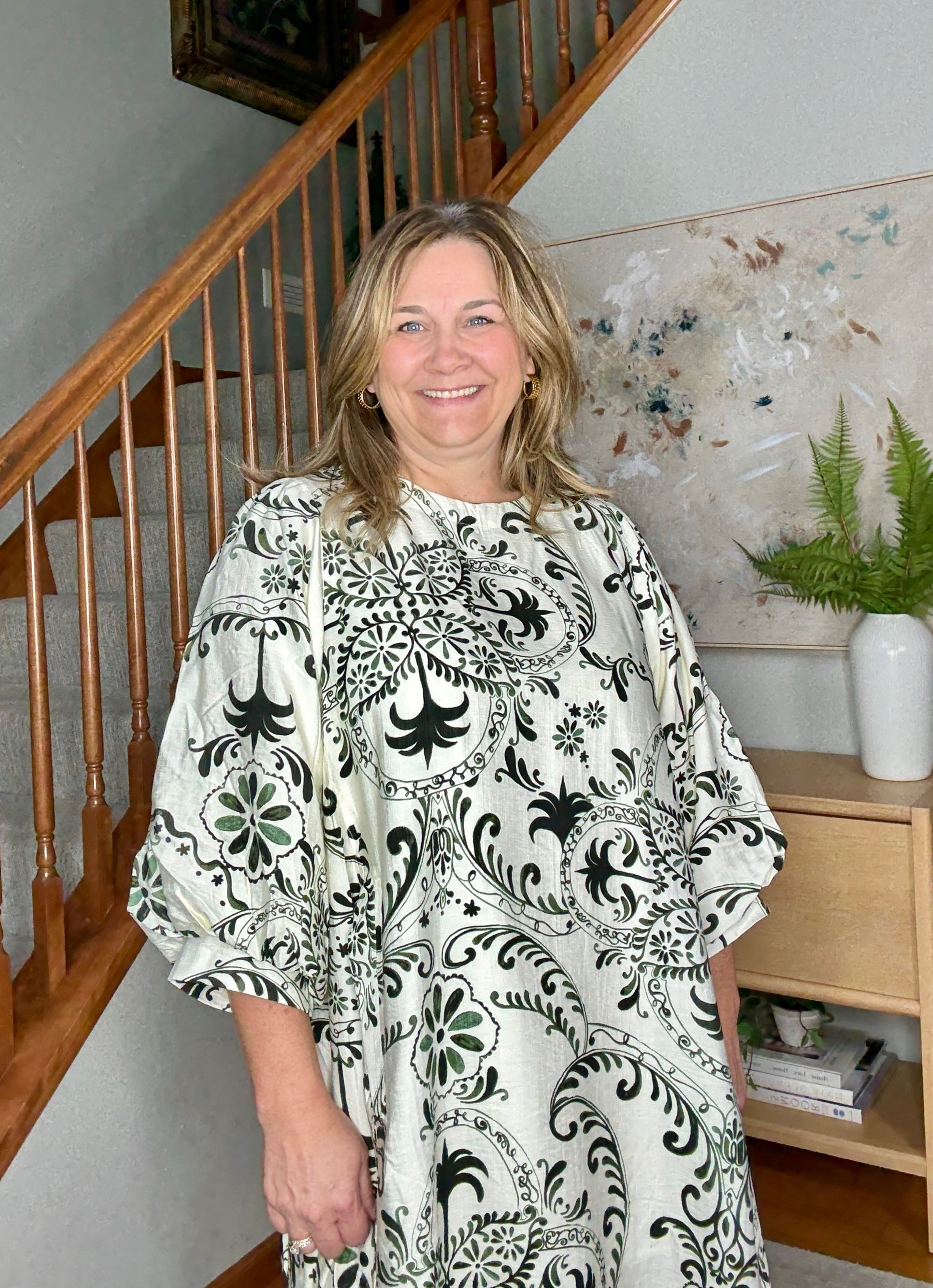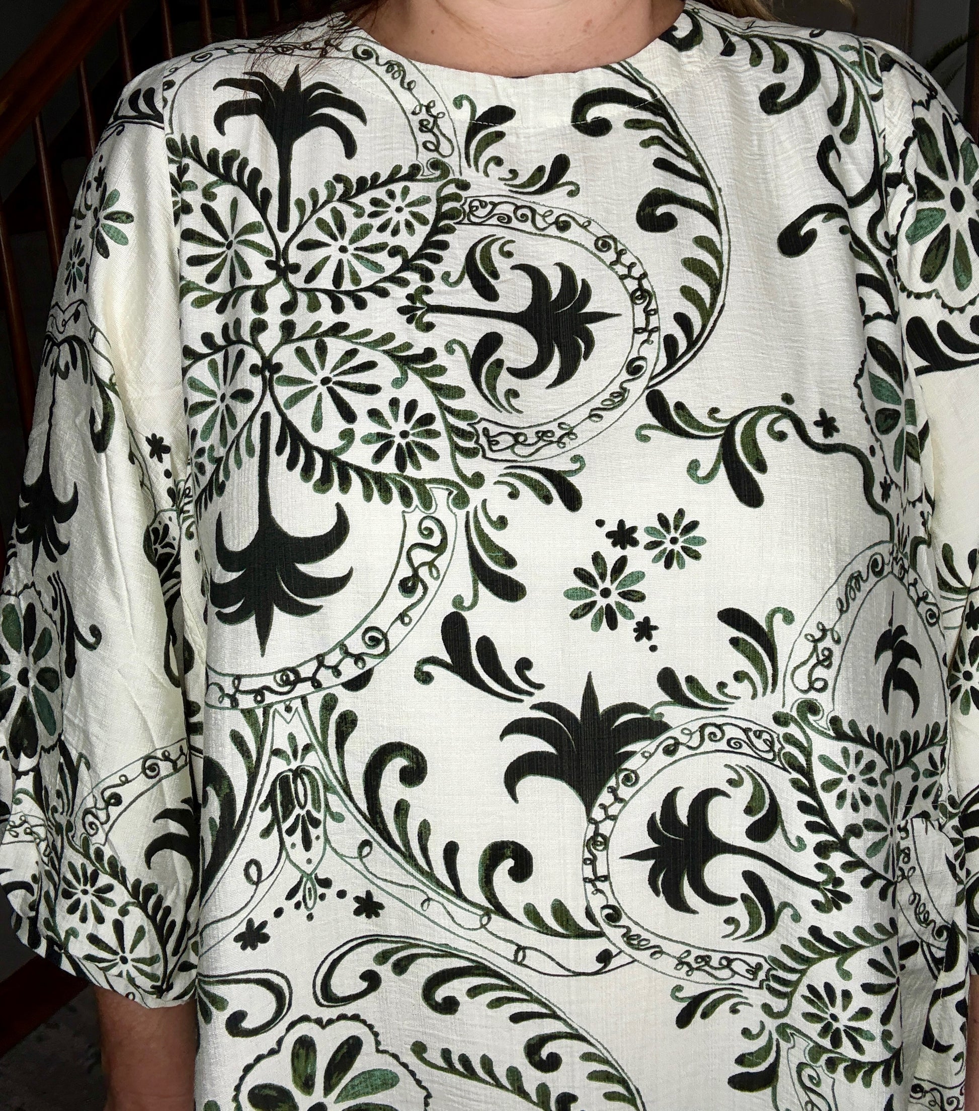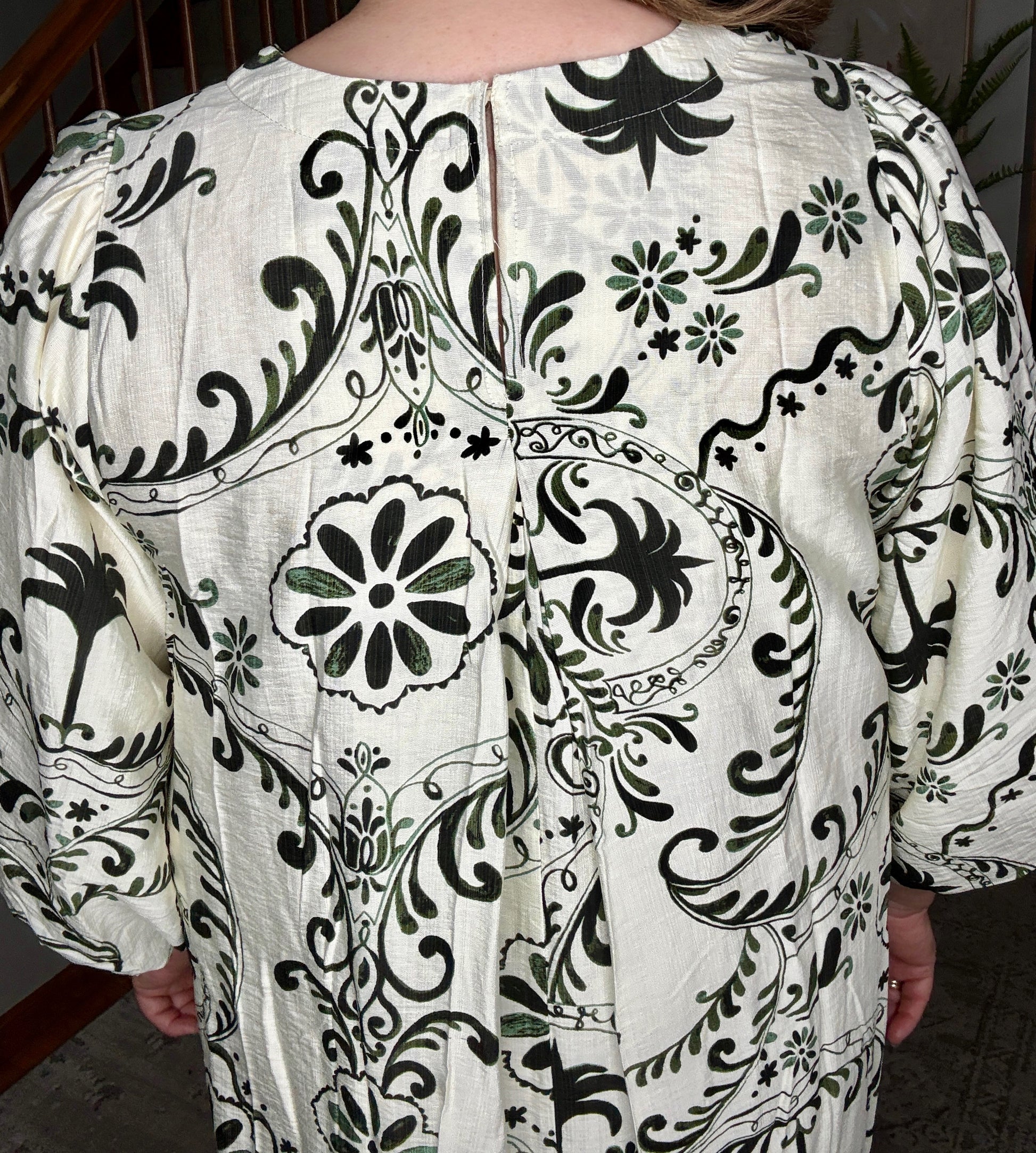 This elegant Boho Printed Balloon Sleeve Mini Dress displays a charming vintage paisley pattern in soft cream and black hues. Highlighted by unique balloon sleeves with gathered elastic cuffs, it creates a graceful bohemian shape. Made from lightweight woven fabric, the dress combines comfort with effortless style through its relaxed fit and flowing silhouette. Featuring a round neckline and long sleeves, it offers tasteful coverage without compromising on fashion. Ideal for casual gatherings, weekend brunches, or boho-inspired events, its versatile cream base adorned with detailed black paisley designs allows for seasonal styling with ease.