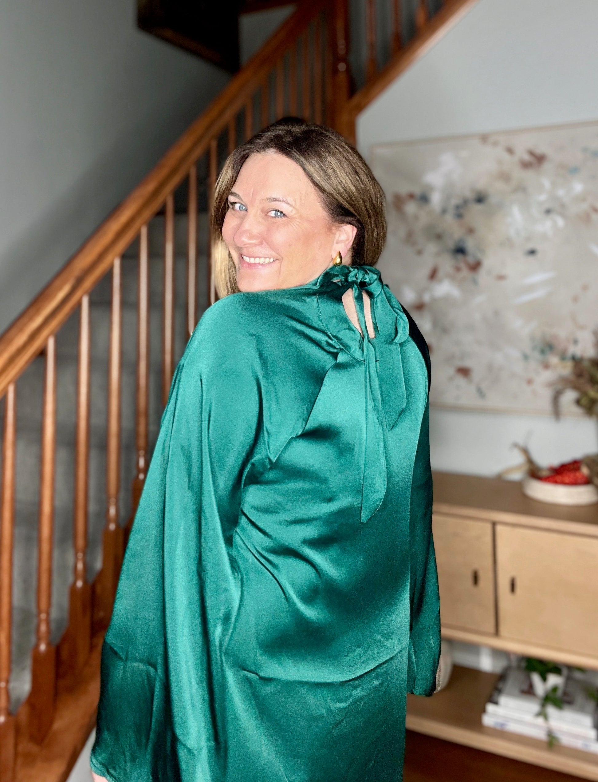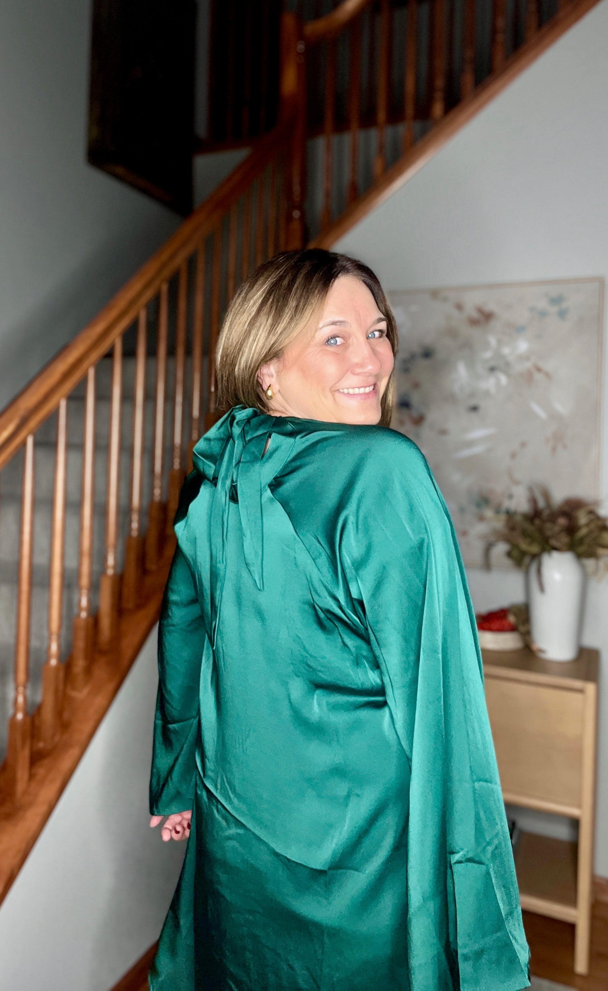 Float like a butterfly in our Isn't It Lovely dress. With a banded mock neckline and raglan bell sleeves, this poly satin dress exudes elegance. The A-line silhouette and back cased elastic provide a comfortable and flattering shape. Plus, the functional back neck tie adds a charming detail.