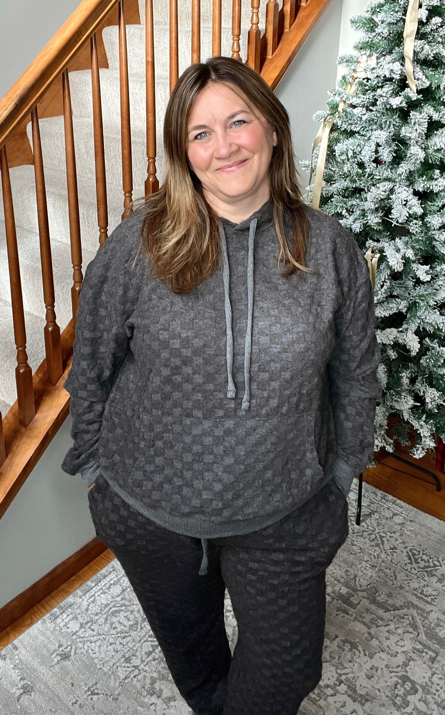 Look no further for the perfect weekend outfit—the Mic Check Checkered Lounge Set is here! Comfortable and stylish, this set features a checkered Hacci knit hooded sweatshirt with kangaroo pocket and matching joggers for a cozy, yet chic look. Unwind in style today!