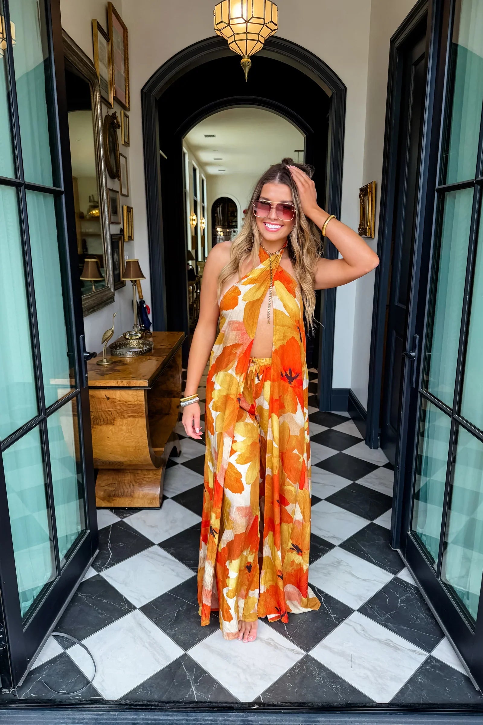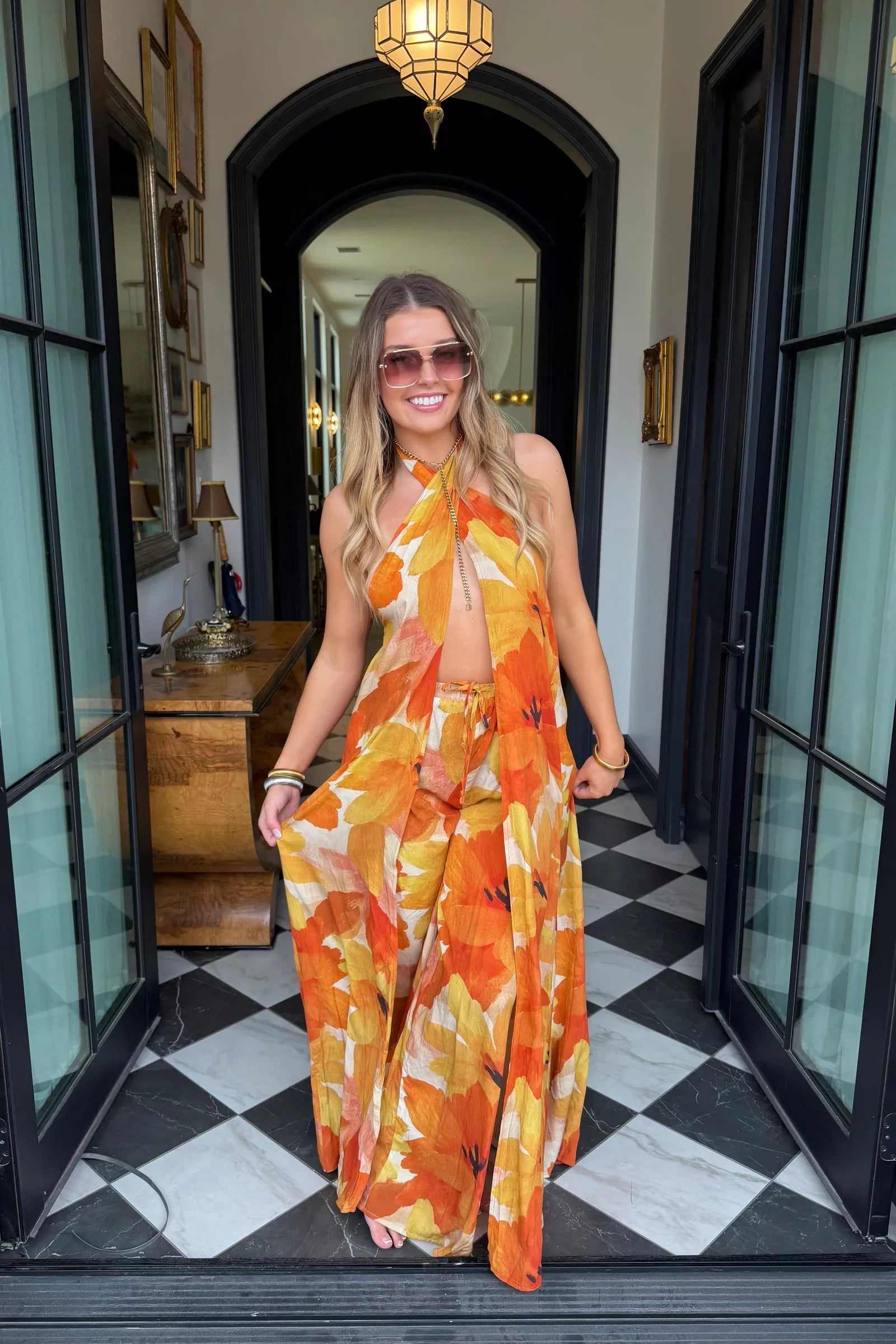 Turn up the heat in this stunning tropical halter two-piece set! Featuring a flowy open-front halter top and wide-leg pants (with elastic waist) with a breezy, relaxed fit, this set captures effortless resort style. The bold orange and yellow floral print radiates sunshine vibes, perfect for beach getaways, summer parties, or vacation strolls.