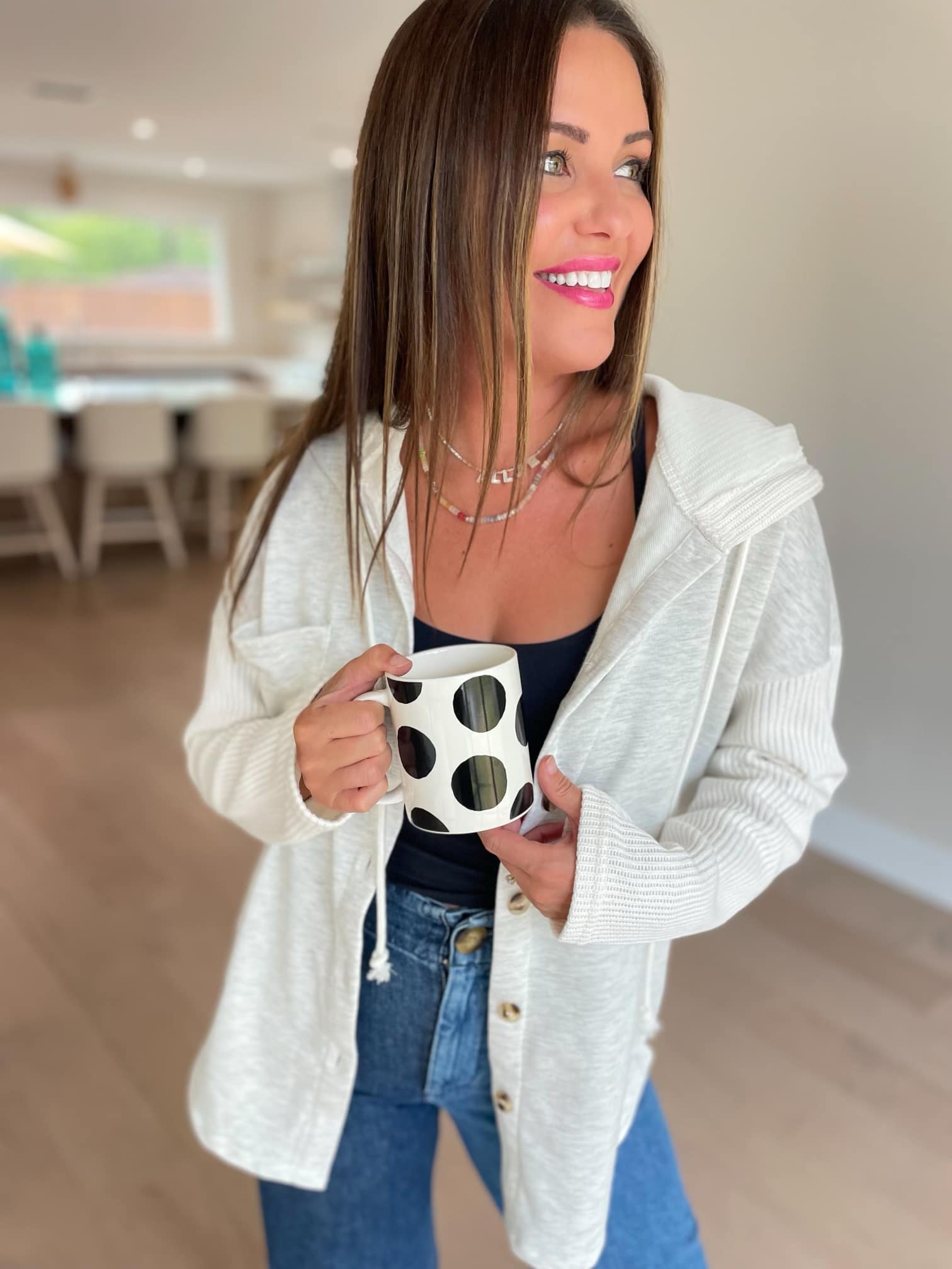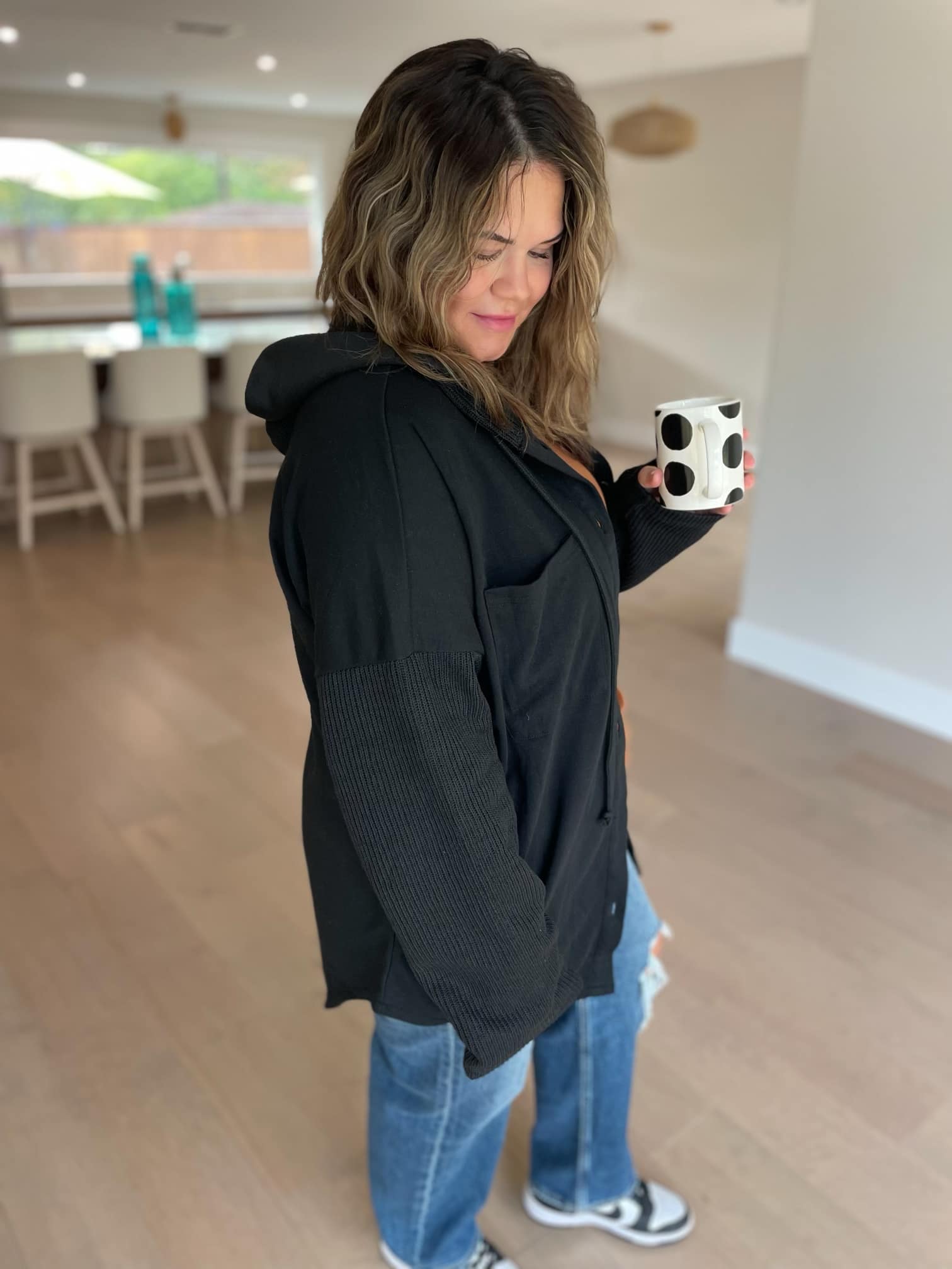 The sweater knit hood and sleeve details add such a sophisticated touch to this button up jacket! The body is a medium weight sweatshirt fabric and we love the oversized hood with functional drawstring.