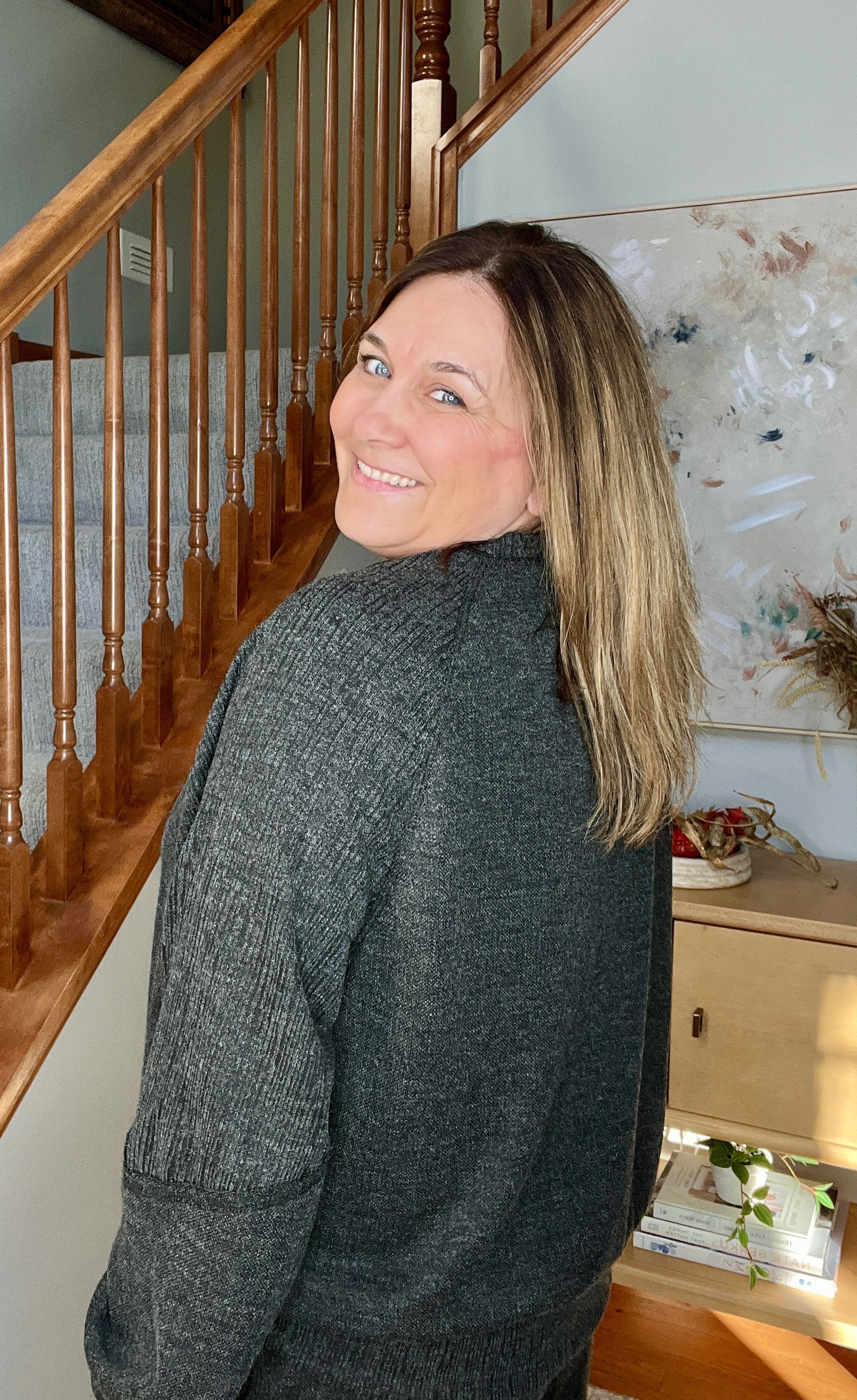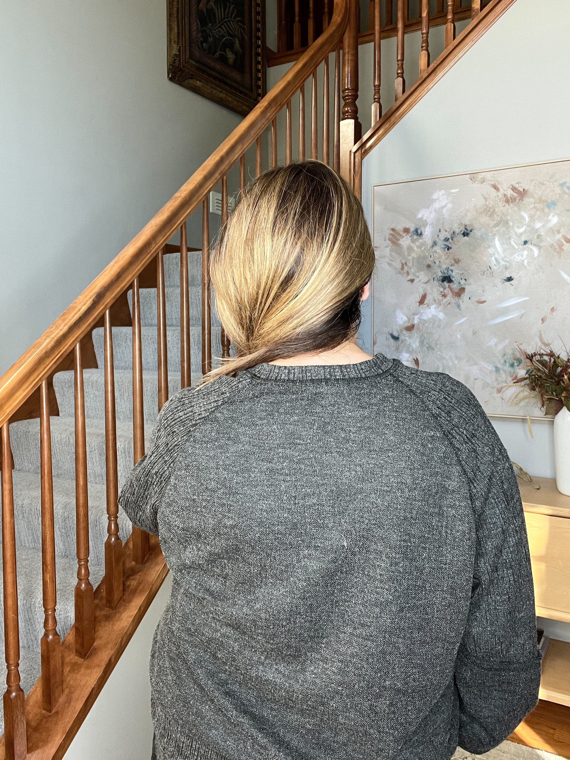 Top: Relaxed pullover with subtle seam detailing, ribbed hemline, and roomy raglan sleeves for a laid-back yet polished look.
