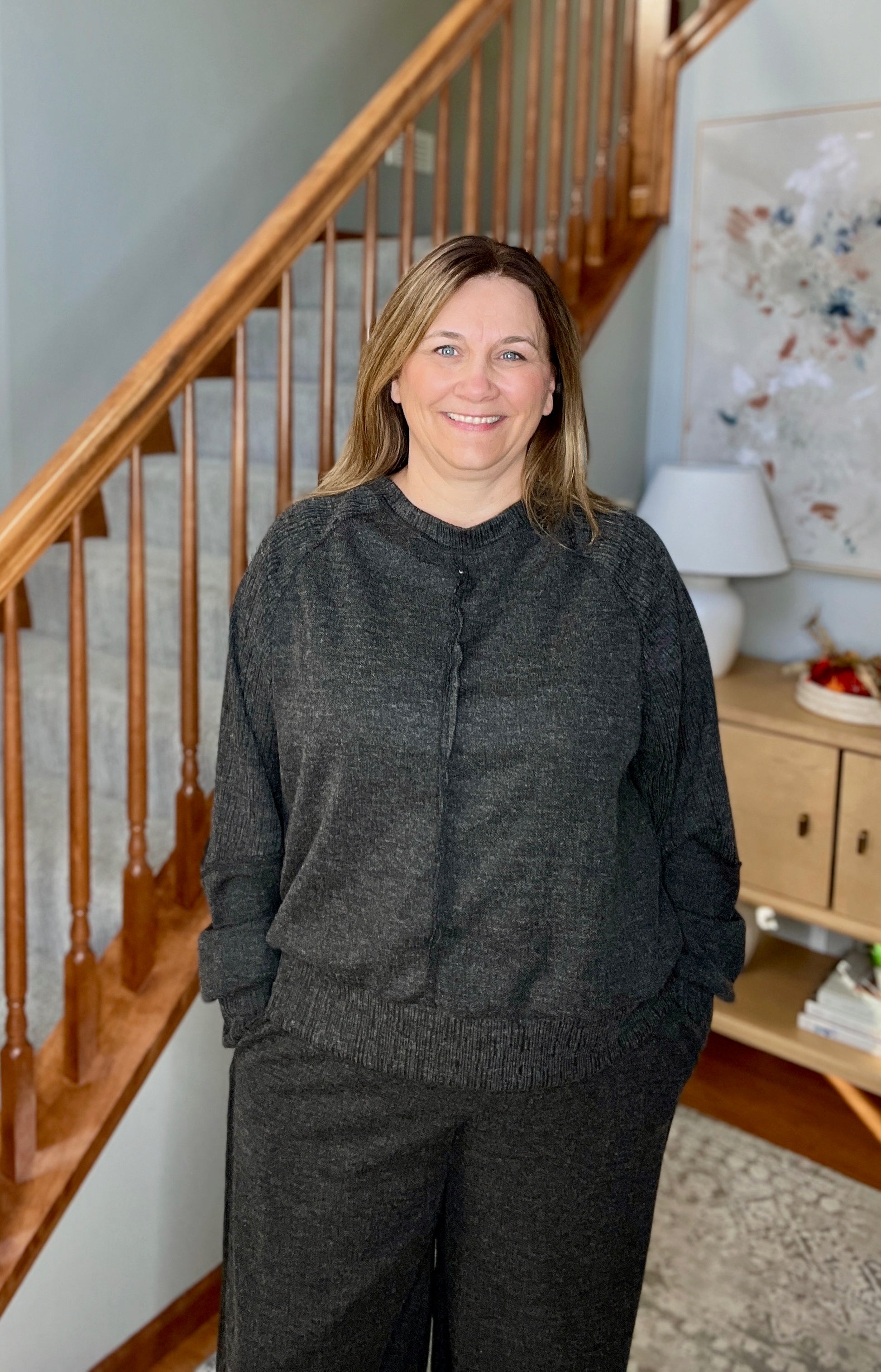 Bottoms: Coordinating wide-leg pants with an easy elastic waistband, side seams, and pockets for all-day wearability.
